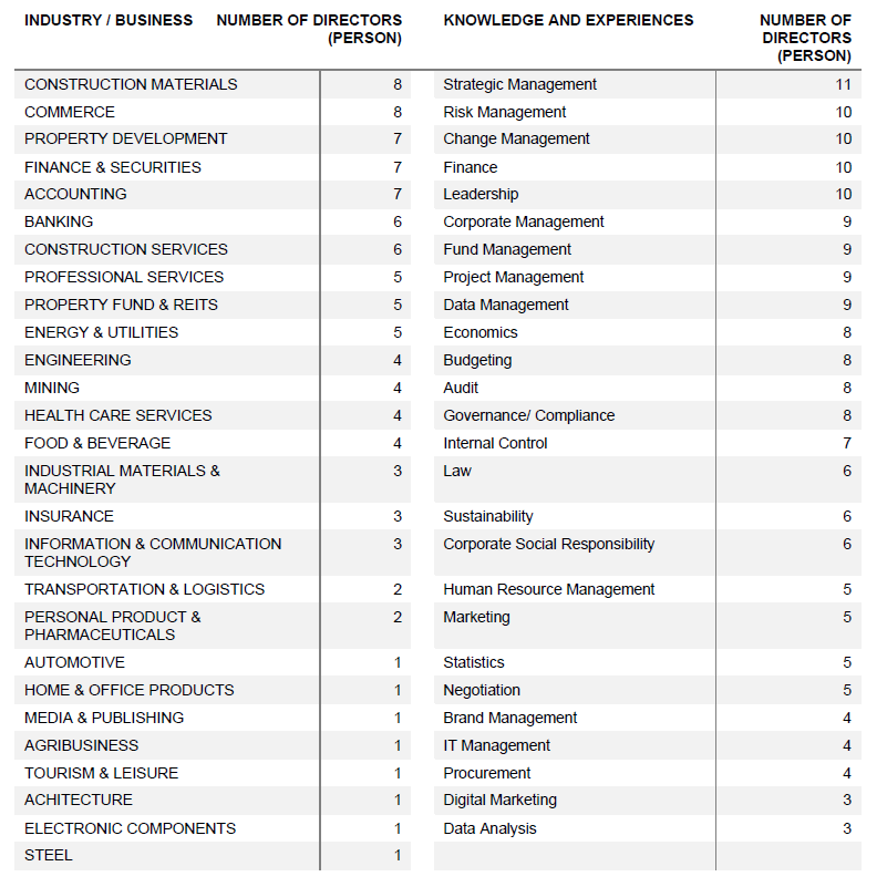 The Board consists of directors with qualifications, competencies, independence and diversity in age, gender, skills and experiences. The Board also has a proper proportion of independent directors, with number of non-executive directors more than half of the total Board members. The Board is of the opinion that its size and composition are suitable with the size, sector and complexity of the Business, as well as aligns with the principle of the good corporate governance. Board composition has evolved and is appropriate.