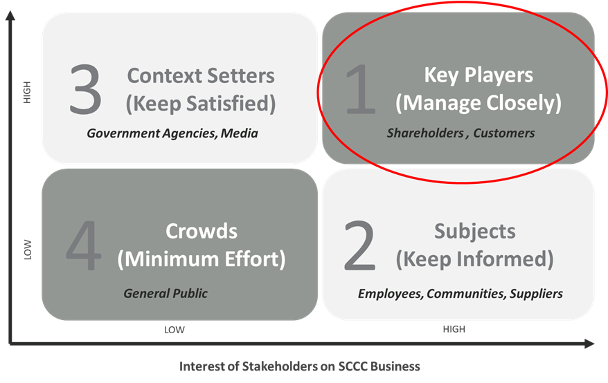 SCCC's stakeholders consist of individuals or entities affected, either positively or negatively, by SCCC's business activities, as well as those with the ability to influence SCCC's operations. These stakeholders, spanning across the past, present, and future, can be classified into seven main categories: Employees, Customers, Communities, Goods and Service Suppliers, Shareholders, Government Agencies and Independent Organizations, and Media.