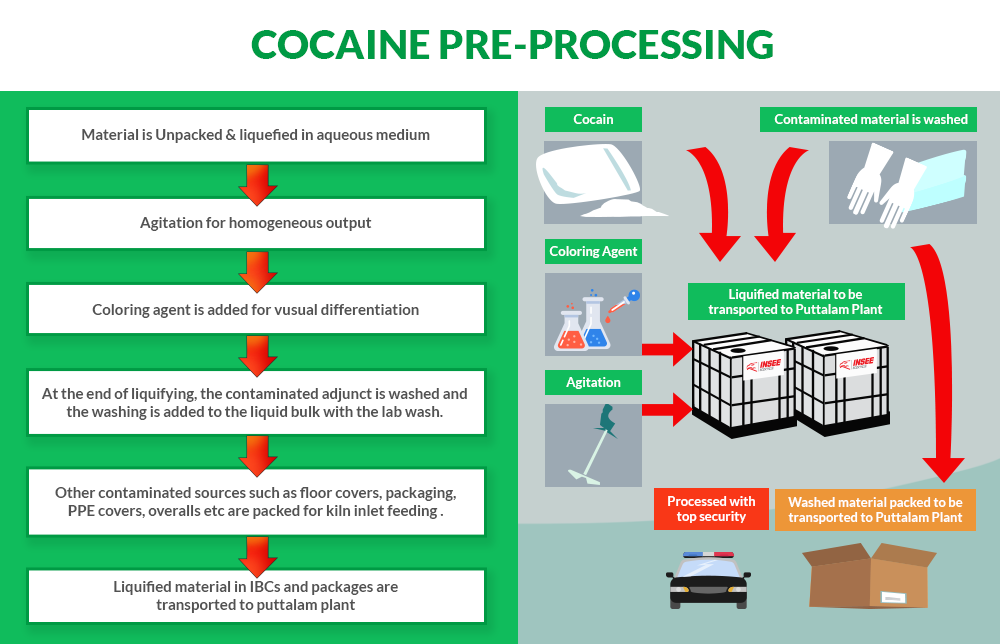 The confiscated Cocaine is liquified in an aqueous medium to ensure that this material is completely disposed of through a liquid line rather than through a solid feeding line. The pre-processing involves a conversion of the chemical structure and the physical state of the material. As per the calculated ratios in pre-trials, the material is dissolved in water ensuring zero residual remains. For visual differentiation of the material, a coloring agent is added. Pre-processing is done under high security to prevent re-production of Cocaine through neutralization.