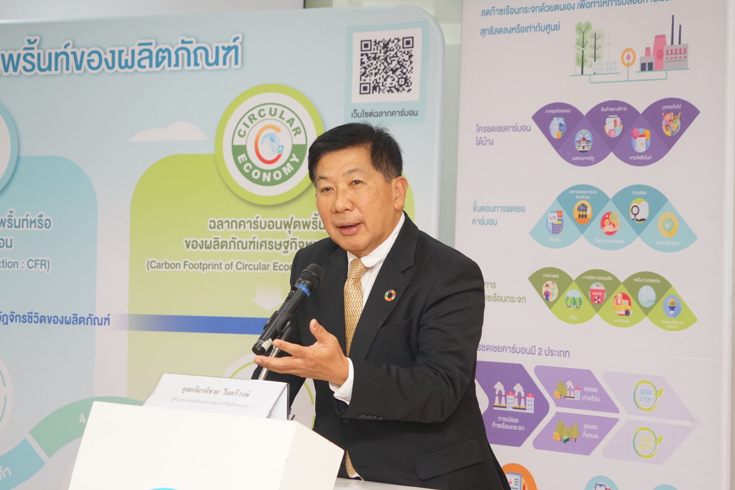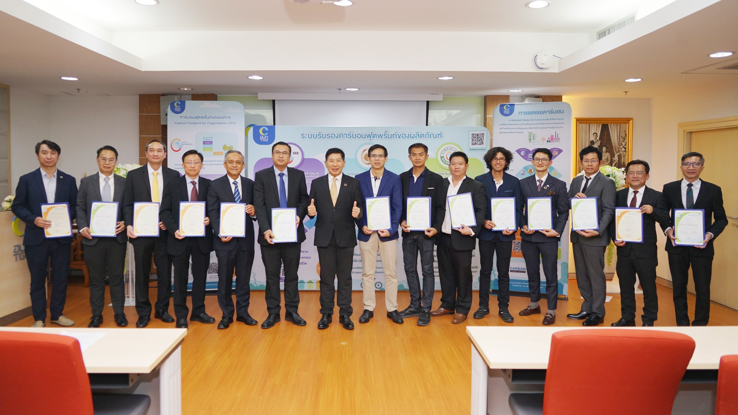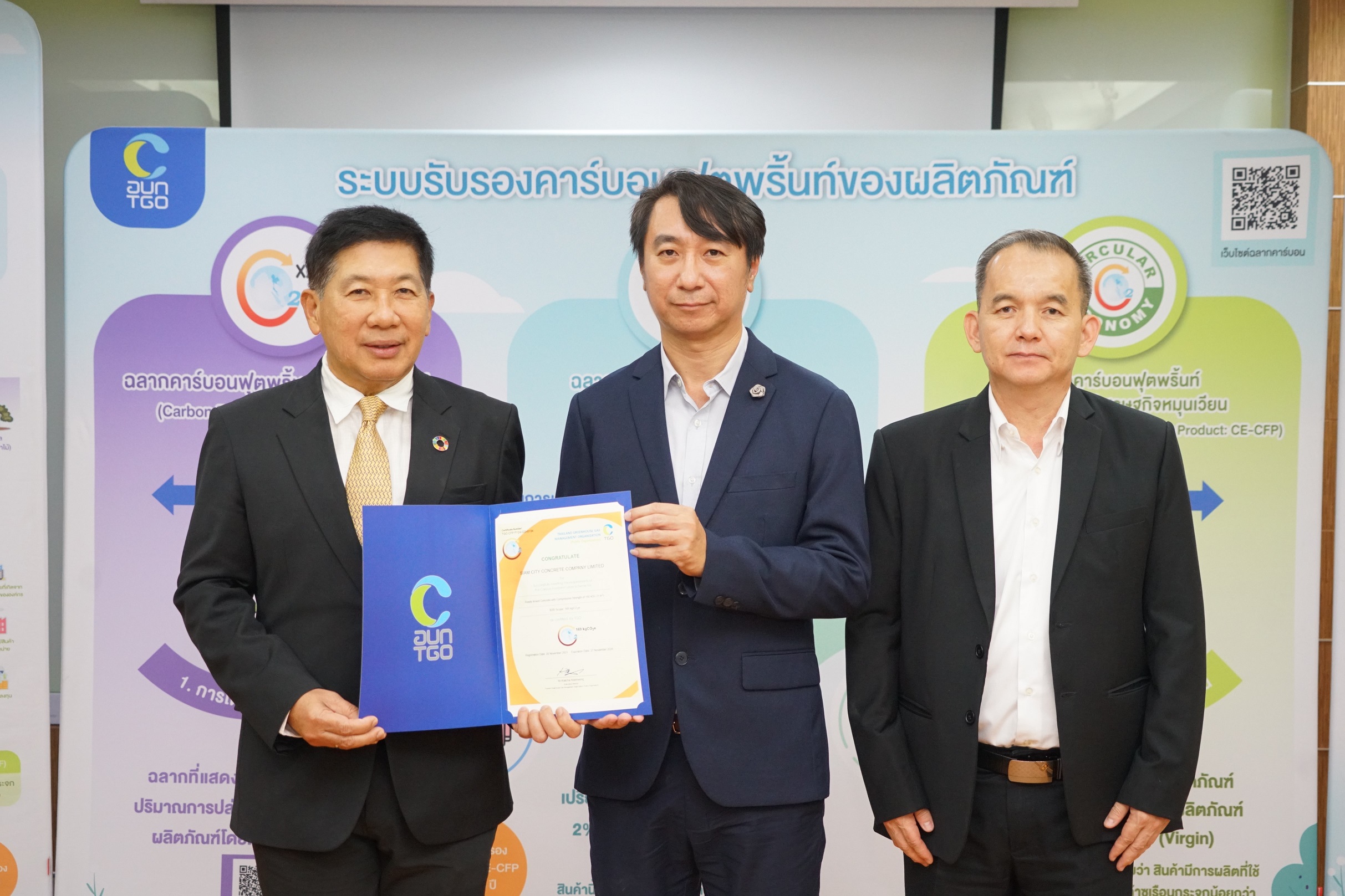 คุณวรวิน ผดุงม่วงทอง Head of RMX Production and Technical Support คุณไพศาล วิไลวรรณาภรณ์ Government Affairs and Business Advisory Manager เป็นตัวแทนบริษัท นครหลวงคอนกรีต จำกัด รับมอบประกาศนียบัตรการรับรองอนุญาตให้ใช้เครื่องหมายรับรองคาร์บอนฟุตพริ้นท์จากคุณเกียรติชาย ไมตรีวงษ์ ผู้อำนวยการองค์การบริหารจัดการก๊าซเรือนกระจก (องค์การมหาชน) หรือ TGO (Thailand Greenhouse Gas Management Organization) ในฐานะที่เป็นองค์กรที่มีส่วนช่วยสนับสนุนให้เกิดโครงการลดก๊าซเรือนกระจกภายในประเทศเพื่อต่อสู้กับปัญหาภาวะโลกร้อน