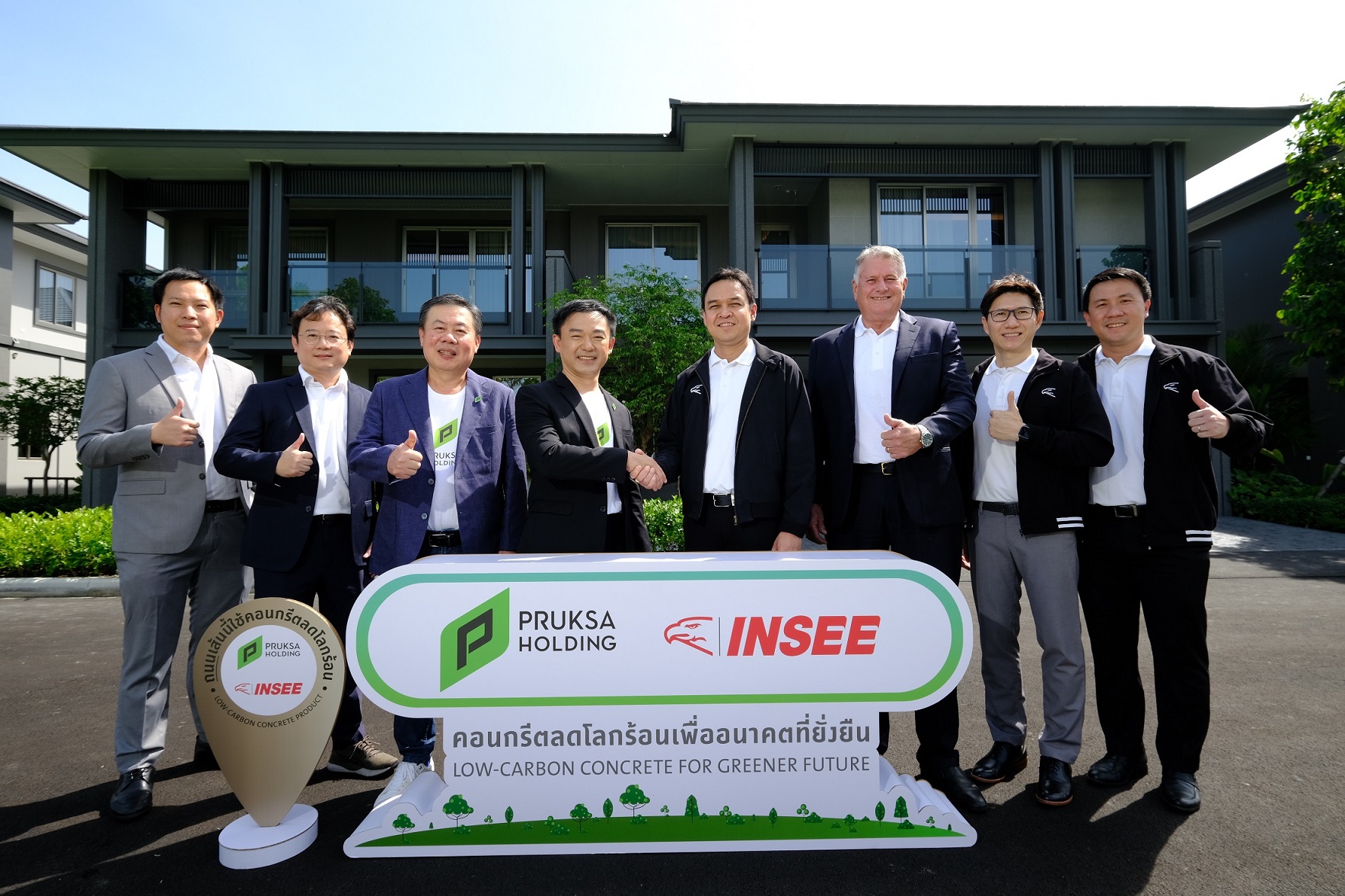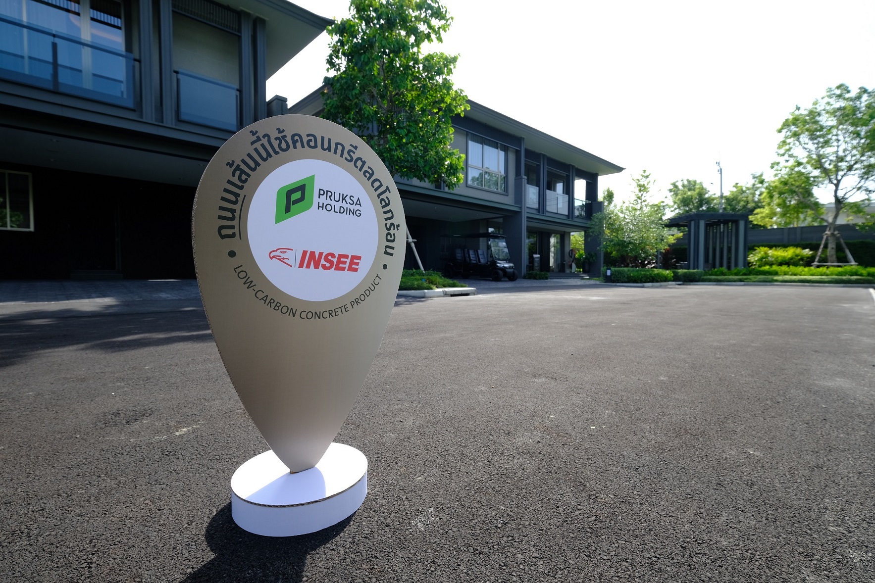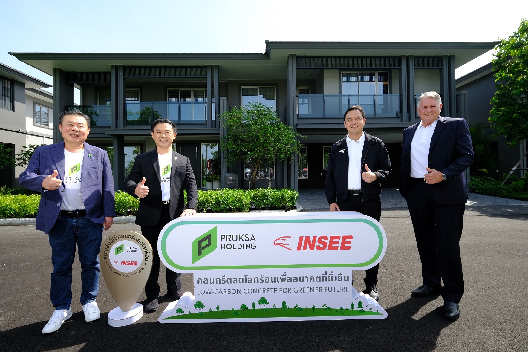 “บ้านภายใต้แบรนด์พฤกษาเป็นบ้านคาร์บอนต่ำ นอกจากการก่อสร้างโครงการโดยเลือกใช้ปูนรักษ์โลกจาก ปูนซีเมนต์อินทรีเพชร Easy Flow พฤกษายังเป็น ผู้พัฒนาอสังหาริมทรัพย์รายแรกที่ใช้คาร์บอนเคียว ซึ่งเป็นเทคโนโลยีสีเขียวในการผลิตแผ่นพรีคาสท์คาร์บอนต่ำในการสร้างบ้าน โดยนำคาร์บอนไดออกไซด์ที่เป็นตัวการสำคัญในการทำลายชั้นบรรยากาศมาฉีดกักเก็บเข้าไปในขั้นตอนการผสมคอนกรีต จึงช่วยลดการปล่อยคาร์บอนและก๊าซเรือนกระจกอื่น ๆ ขณะเดียวกันยังสามารถลดปริมาณการใช้ซีเมนต์ลงร้อยละ 5 แต่ยังคงประสิทธิภาพความแข็งแกร่งได้ตามมาตรฐาน และเมื่อเร็ว ๆ นี้ องค์การบริหารจัดการก๊าซเรือนกระจก ได้ประกาศรับรองคาร์บอนฟุตพริ้นท์ให้กับ อินโน พรีคาสท์ โดยได้รับฉลากลดคาร์บอนฟุตพริ้นท์ Carbon Footprint Reduction (CFR) หรือฉลากลดโลกร้อน ซึ่งถือเป็นพรีคาสท์รายแรก รายเดียว ของอุตสาหกรรมในประเทศไทยที่ได้การรับรอง อีกทั้งยังมีวัสดุก่อสร้างอื่น ๆ ด้วยเช่นกันที่ได้รับฉลากคาร์บอนฟุตพริ้นท์ของผลิตภัณฑ์ Carbon Footprint of Product (CFP)