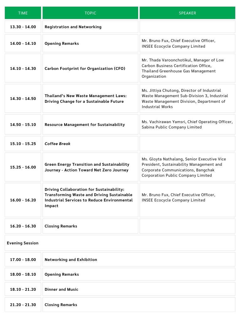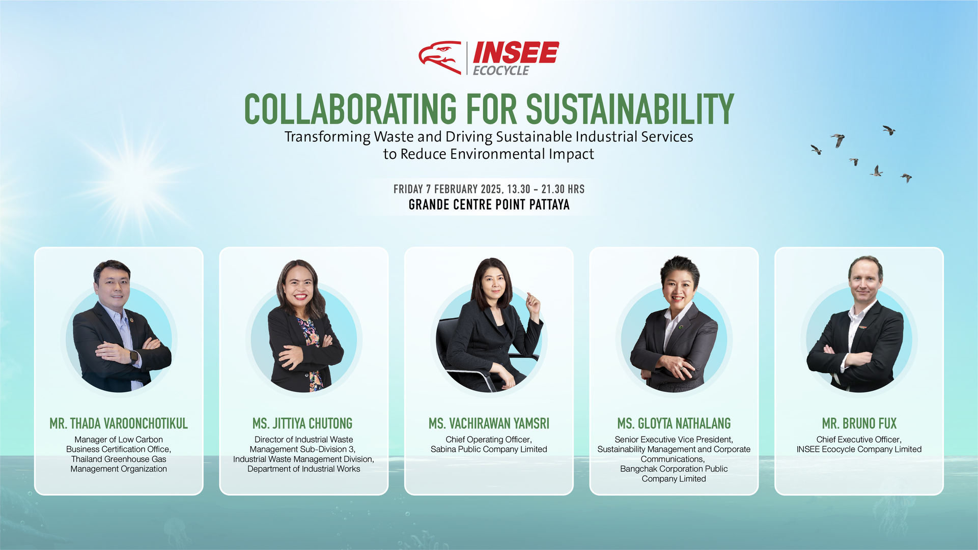 INSEE Ecocycle Company Limited, it is our pleasure to invite you to our event, “Collaborating for Sustainability”. This special occasion will take place on Friday, 7 February 2025, from 13:30 to 21:30 hrs, at Grande Centre Point Pattaya, Na Kluea, Bang Lamung, Chonburi. The event will feature a knowledge-sharing session on sustainable waste management and industrial services, followed by a celebratory dinner to honor and strengthen our sustainable partnerships. We hope you can join us for this meaningful and enjoyable event.