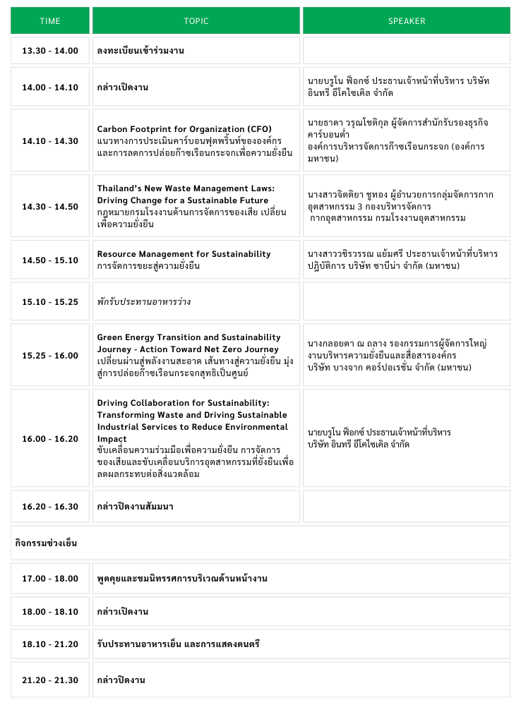 บริษัท อินทรี อีโคไซเคิล จำกัด ขอเชิญท่านเข้าร่วมงานสัมมนาภายใต้หัวข้อ Collaborating for Sustainability ร่วมมือมุ่งสู่เป้าหมายความยั่งยืน” ในวันที่ 7 กุมภาพันธ์ 2568 เวลา 13.30 – 21.30 น. ณ โรงแรม แกรนด์ เซนเตอร์ พอยต์ พัทยา อำเภอบางละมุง จังหวัดชลบุรี โดยภายในงานท่านจะได้แลกเปลี่ยนเรียนรู้เกี่ยวกับการบริหารจัดการของเสีย และงานบริการภาคอุตสาหกรรมอย่างยั่งยืน พบปะสังสรรค์ระหว่างผู้บริหารและทีมงาน